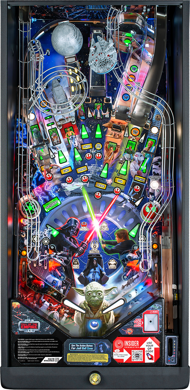 In Stern Pinball’s Star Wars: Fall of the Empire pinball games; players will take part in the adventures that started it all and experience iconic Star Wars-inspired moments through a pinball experience like no other. Players will take down the AT-AT by attaching their snowspeeder’s tow cable and shooting the spiral ramp to send it crashing down, mirroring the breathtaking scene from Star Wars: The Empire Strikes Back. Destroy the Death Star II from Star Wars: Return of the Jedi by lowering shields on the battle station during Death Star Multiball to save the galaxy. Players can also escape from Cloud City when reactivating the Millennium Falcon’s hyperdrive by hitting the center jump ramp to escape to hyperspace. Throughout the pinball experience, players will enter Jabba the Hutt’s Sarlacc Pit, battle stormtroopers, defeat TIE fighters, and even mimic usingthe Force to save your ball on the journey to defeating the Empire. Feel the power of the dark side as you enjoy special Darth Vader-inspired modes.